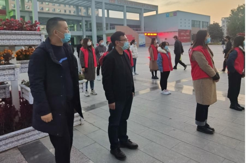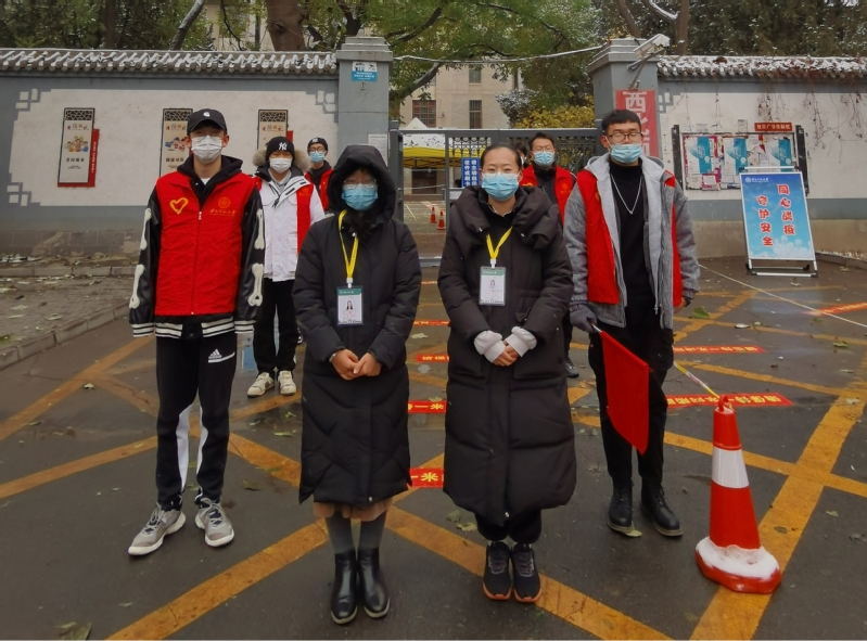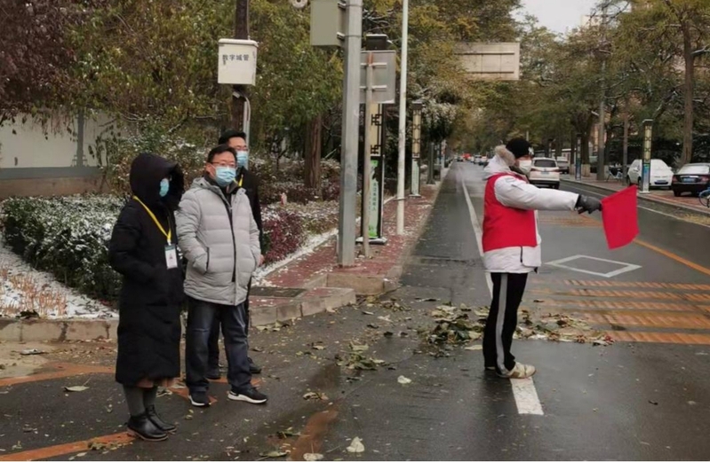 11月6日下午,兰州市气温降到0℃以下,天空飘着雪花。于国建书记来到参与学校南门值班的党员先锋岗和青年志愿者身边,看望现场的辅导员和学生志愿者,并与他们一起值班,代表学院全体教职工向参与志愿服务的学生致以崇高敬意和由衷感谢!于国建要求现场辅导员要关心关注学生的自我防护和身体健康,叮嘱做好轮岗、轮班,叮嘱根据气温增加衣服,高度关注横穿马路时的学生交通安全;于国建要求全体教职工要坚决落实学校疫情防控工作部署要求,主动担责,切实压实工作责任,创新工作方式,突出对学生的人文关怀和心理健康指导,引导学生自主适应疫情防控常态化下的各项管控措施,立足本职岗位,主动担当作为;于国建要求全体党员要身先士卒,冲锋陷阵,严格遵守甘肃省纪委监委疫情防控“八个严禁”纪律要求,切实落实学校党委《关于全力做好新冠肺炎疫情防控工作充分发挥基层党组织战斗堡垒作用和党员先锋模范作用的通知》精神,扛起责任,形成合力,冲锋在先,坚决守护全体师生的生命安全和身体健康,坚决打赢疫情防控遭遇战、阻击战。