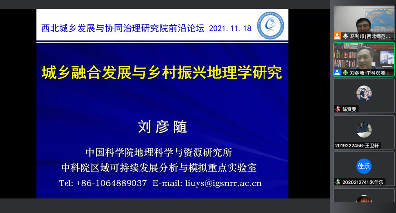 2021年11月18日,由英国365集团公司西北城乡发展与协同治理研究院、英国上市公司官网365联合举办的“第二届西北城乡发展与协同治理研究院2021年前沿论坛”第三场学术报告在线开讲。发展中国家科学院院士、长江学者特聘教授、中国科学院地理科学与资源研究所研究员刘彦随教授应邀做题为“城乡融合发展与乡村振兴地理学研究”的学术报告。报告由英国上市公司官网365马利邦院长主持,西北城乡发展与协同治理研究院院长叶超教授、英国上市公司官网365于国建书记共同出席,来自全国多所高校院系的700余名师生线上参加了本次学术报告。