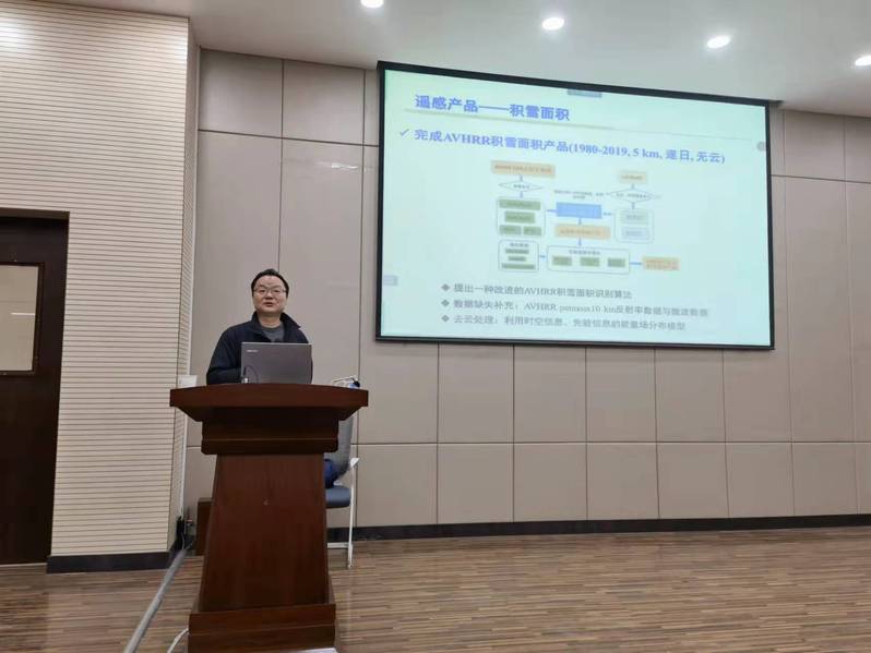 报告会上,车涛研究员首先介绍了积雪研究的气候学意义、水资源和人文服务功能价值以及灾害影响,然后详细阐述了积雪的特点、地面观测要素和相关仪器设备,并结合国家科技基础资源调查专项“中国积雪特性及分布调查”介绍了近期我国积雪调查进展情况及取得的最新成果。之后,车涛研究员从积雪遥感反演原理和算法角度论述了光学遥感影像和微波数据在积雪观测中的作用,以及不同算法的适用场景和精度评价结果。最后,车涛研究员介绍了其团队新近研发的不同类型积雪遥感产品。报告会后,车涛研究员与参会师生进行了深入广泛交流。