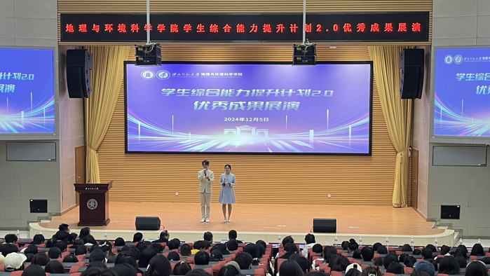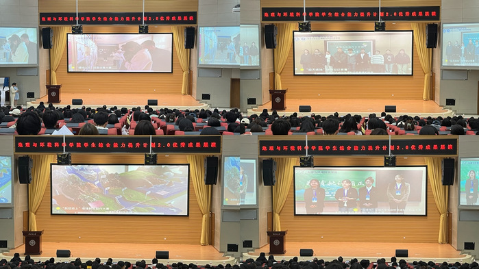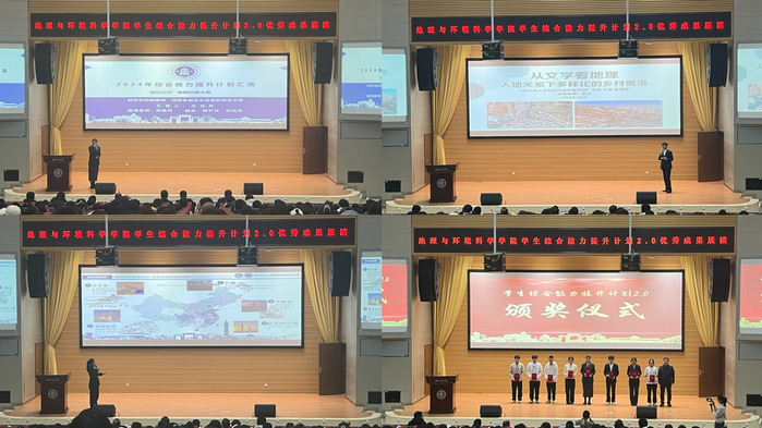 展演期间,获得“跃然纸上”地理教具制作大赛、“异境笔景”教案设计大赛、“吾爱吾师”系列教学技能大赛、“谱绘山河”地图创意大赛、“山川异志”地理知识科普讲堂大赛、“国地杯”第六届全国大学生自然资源科技作品大赛、甘肃省大学生GIS地图制图应用技能大赛(制图组)、第六届全国大学生市政环境AI+创新实践能力大赛西部赛区虚仿赛、2025年创新创业能力提升计划立项等优秀作品的选手相继进行了展演,展演内容包括《新疆水资源利用的地层原理和工程措施》、《冰川流水地貌》、《农业区位因素与农业布局》、《地球的圈层结构》、《大气垂直分层》、《时空交织的绿洲——河西走廊农业发展的蜕变之旅》、《从文学看地理——人地关系下多样化的乡村聚落》、《揭秘台风:自然界的狂暴巨兽》、《祁连山土壤碳、氮、磷现状调研赋能区域合理造林》、《百里秦淮,坦途如虹-南京市交通系列专题图集》、《福禄遗梦坊——临夏葫芦雕刻技艺的现代传承与乡村振兴之路》、《2000-2020年甘肃省食物消费碳足迹时空格局、驱动因素及模拟优化》等多项内容,涵盖了各个专业知识和特点,充分锻炼和培养了同学们的综合素质和实践能力,凸显了专业特点和培养要求,全面检验和提升了学生专业能力和综合能力。期间,学院对2024年学生综合能力提升计划2.0优秀获奖作品进行了表彰,学院领导依次为获奖选手颁发了荣誉证书。