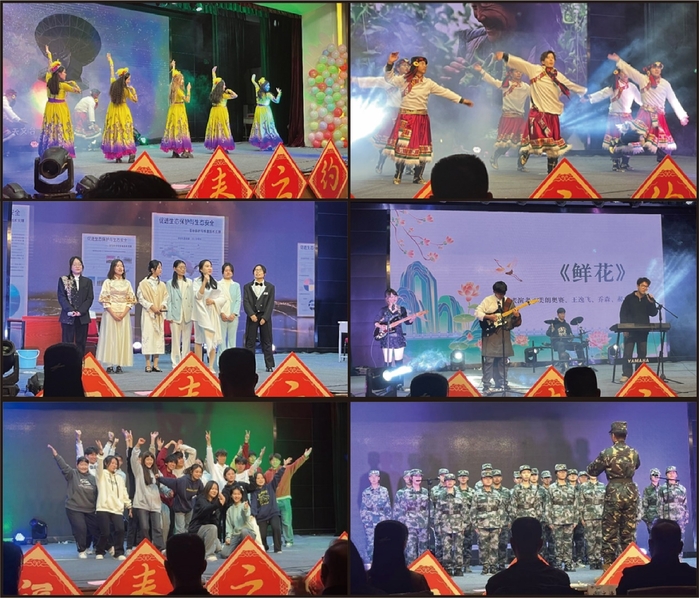 晚会在民族舞蹈《舞动民族情,春回大地兴》中拉开帷幕,展现了民族融合的热情与活力;乐队合唱《鲜花》以激昂的旋律点燃全场,鼓励着青年学子勇敢绽放;小品《明日何其多》、《罗密欧点朱丽叶》以幽默诙谐的方式展示了同学们生活中的点滴趣事,引得观众笑声连连;舞蹈《日不落》、《阳光男孩,阳光女孩》、《桃花朵朵开》用活力四射的舞步,传递出青春的力量和对未来的美好憧憬;歌曲串烧《sweet story》、合唱《我乘着风归来》和乐器演奏《大鱼》用熟悉的旋律触动了观众的心弦,将晚会推向了一个又一个高潮;舞台剧《又见敦煌》展现了地理人对中国文化坚守与传承的贡献,而我校退伍大学生带来的节目《热血青春记》以其蓬勃的朝气,让我们一睹军旅风采。