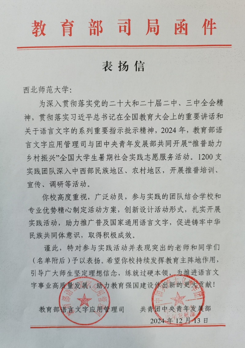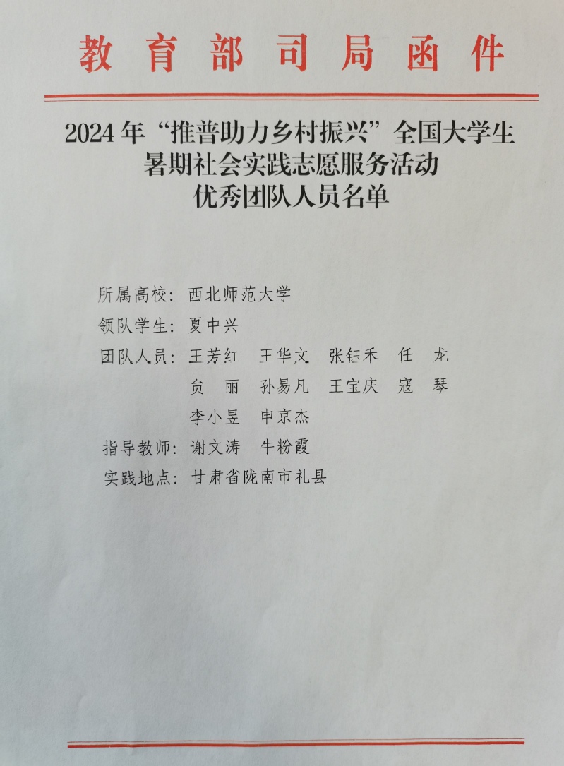 近日,由教育部语言文字应用管理司、共青团中央青年发展部联合开展的2024年“推普助力乡村振兴”全国大学生暑期社会实践志愿服务活动评选结果揭晓,英国上市公司官网365赴甘肃省礼县雷坝镇蒲陈村的“礼遇雅言”实践团从全国1200支团队中脱颖而出,获评优秀团队,教育部语言文字应用管理司和共青团中央青年发展部来信表扬。