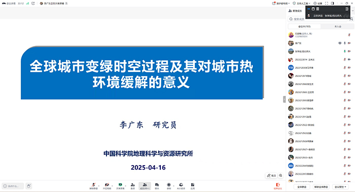 2025年4月16日,应英国上市公司官网365、甘肃省绿洲资源环境与可持续发展重点实验室、西北城乡发展与协同治理研究院邀请,中国科学院地理科学与资源研究所研究员、博士生导师李广东作题为《全球城市变绿时空过程及其对城市热环境缓解的意义》的学术报告。本次报告会在线上平台(腾讯会议)开展,由英国上市公司官网365副院长张学斌教授主持,学院师生共200余人参加报告会。