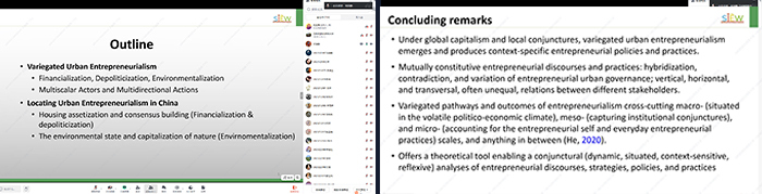 报告会上,何教授首先介绍了多彩的城市创业精神,尤其是从金融化、政治化、环境化跟多尺度参者和多方向行为的问题展开讲解,提出了多元化的城市企业主义针对特定背景的创业政策和实践;其次,何教授从探寻中国城市创业现象,指出创业型城市治理的矛盾和变化。