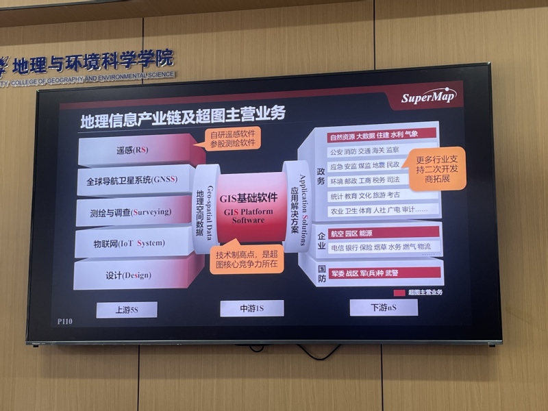报告会上,刘宏恺先生首先介绍了GIS的起源、发展、产业技术及应用热点,从地理空间可视化、地理空间感知、地理空间决策、地理空间设计以及地理空间控制五个维度,深入阐述了IT时代空间智能金字塔的发展历程。然后,结合地理信息产业链及超图主营业务,凭借多年从事GIS领域的丰富经验,分享了一系列新型行业应用案例。最后,借助超图企业文化,为同学们提供了实用的就业指导和职业规划建议。