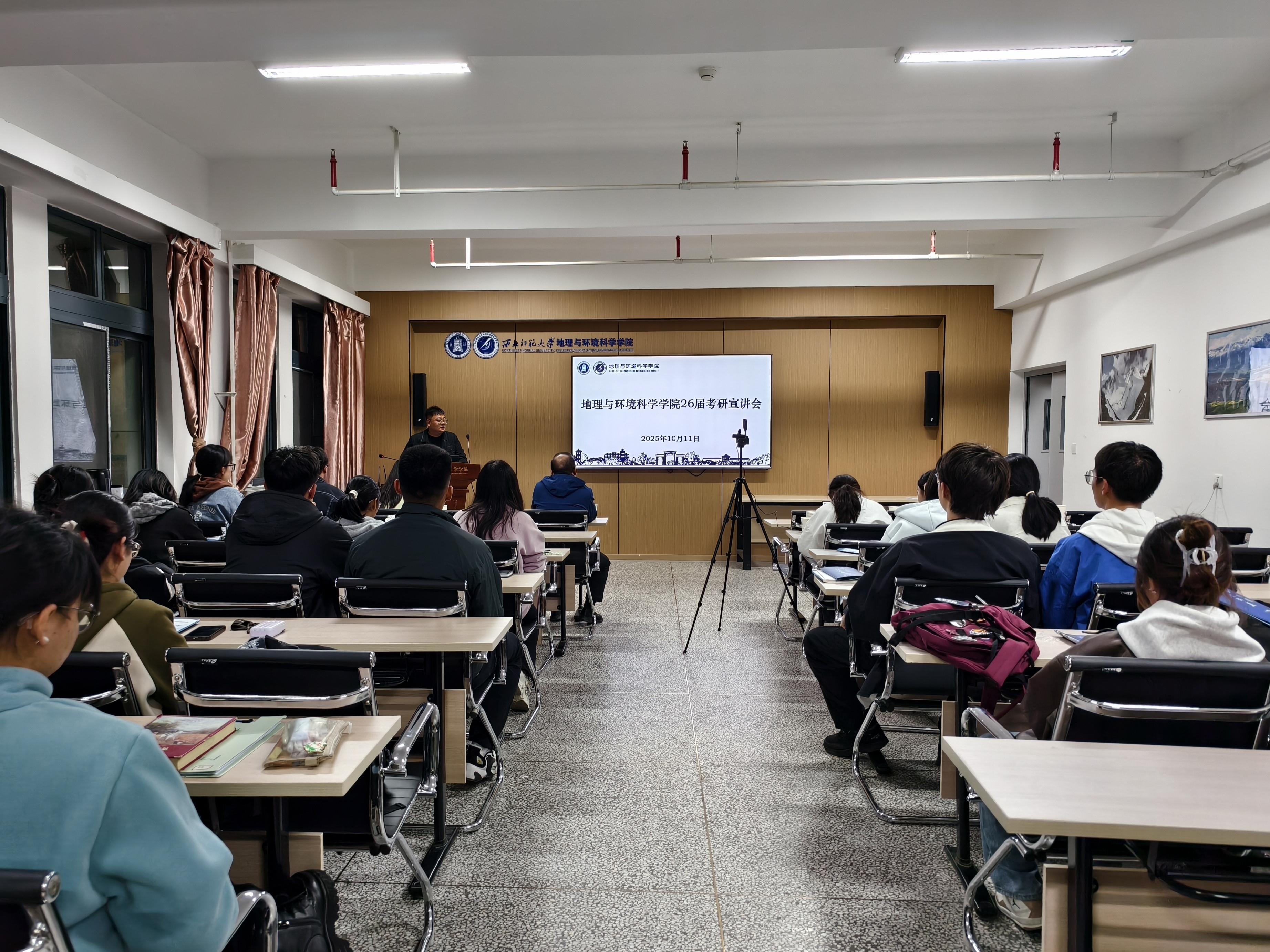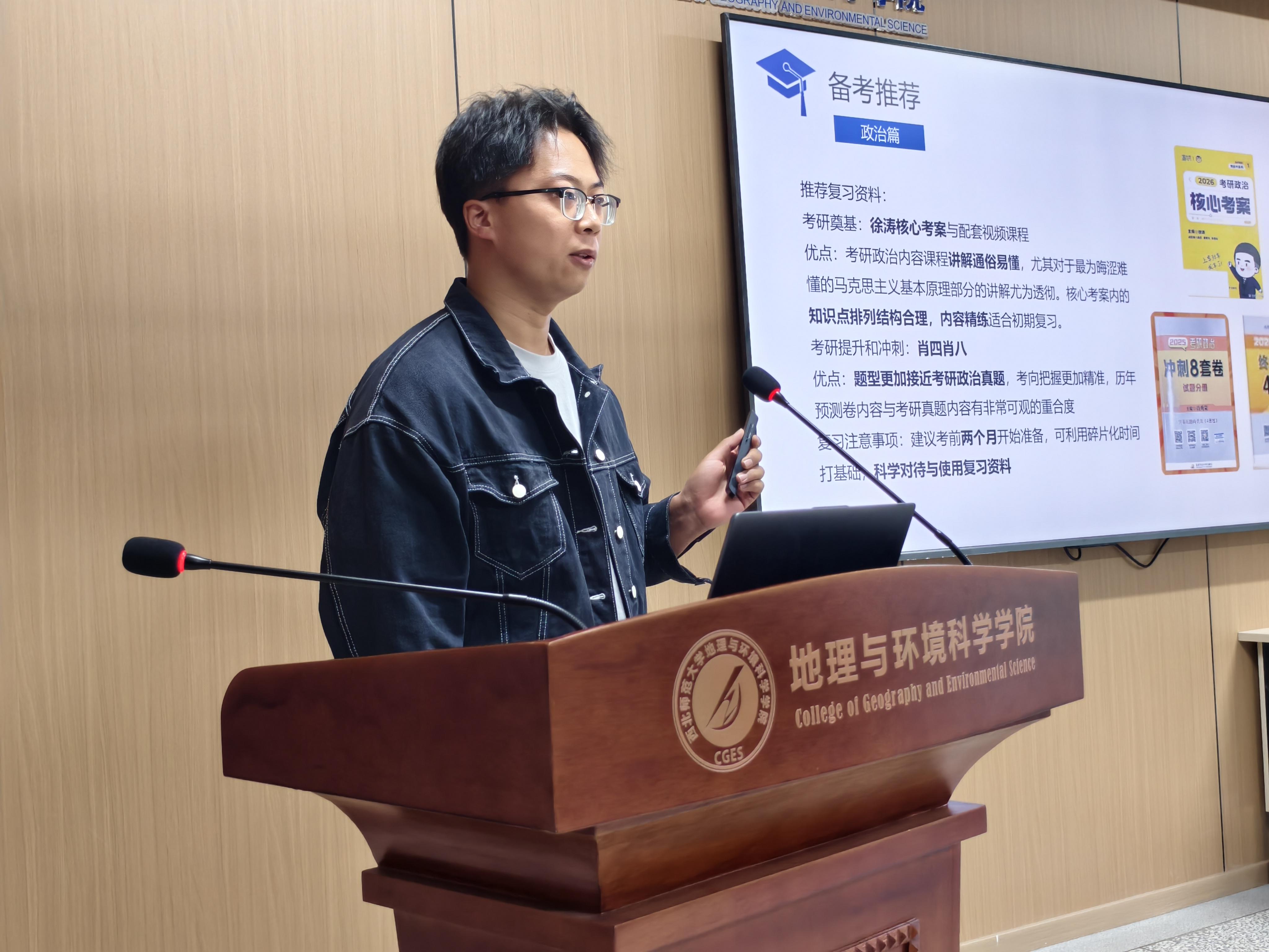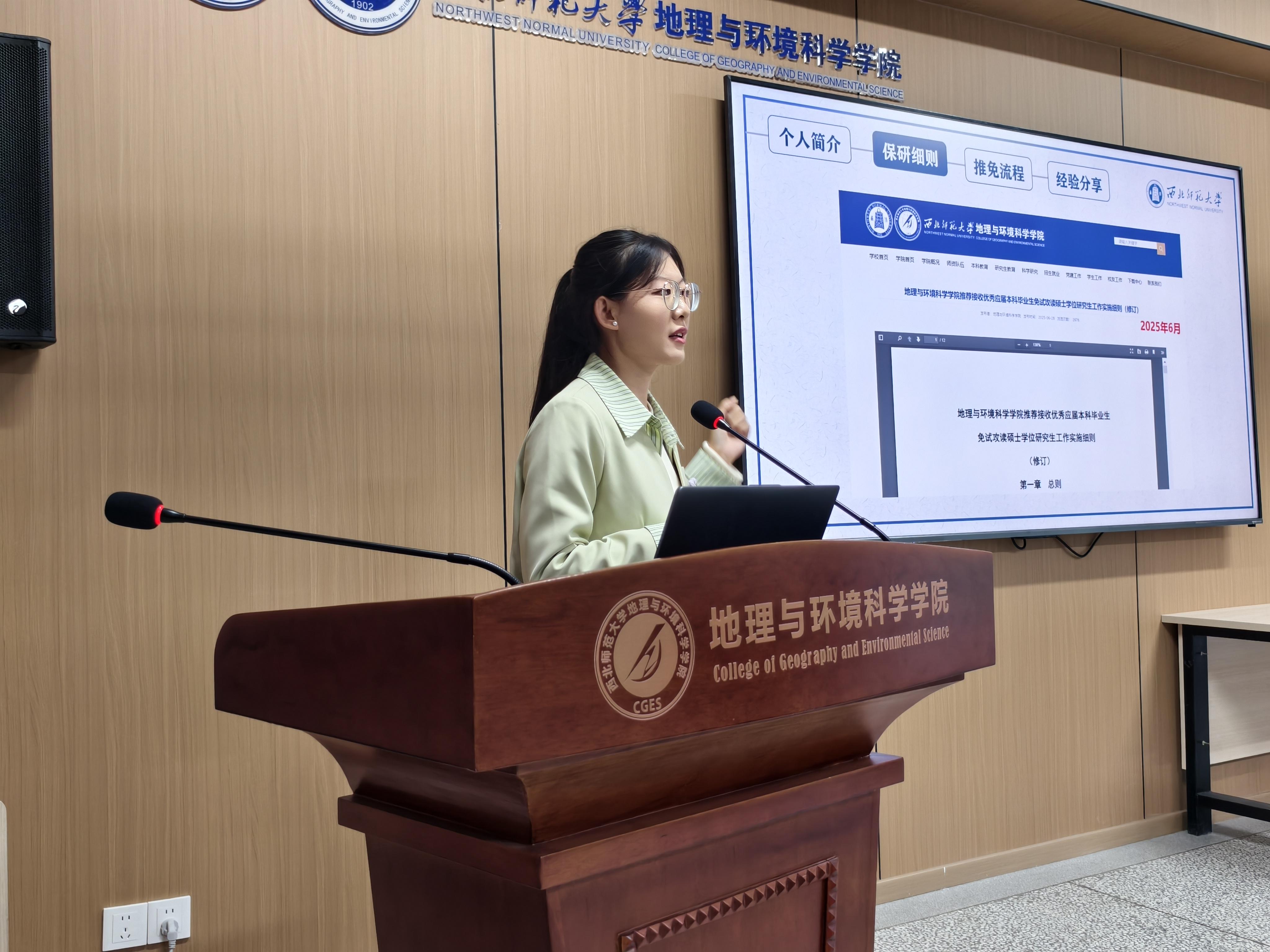 2025级学科教学(地理)硕士研究生史艺杰以《时光为证,步履生花:保研分享会》为题,围绕保研细则、推免流程和经验分享三个维度展开分享,给低年级同学提供了满满的“干货”。2025级地图学与地理信息系统硕士研究生曾潇结合自身的考研经历倾囊相授,为考研学子提供实操指南。