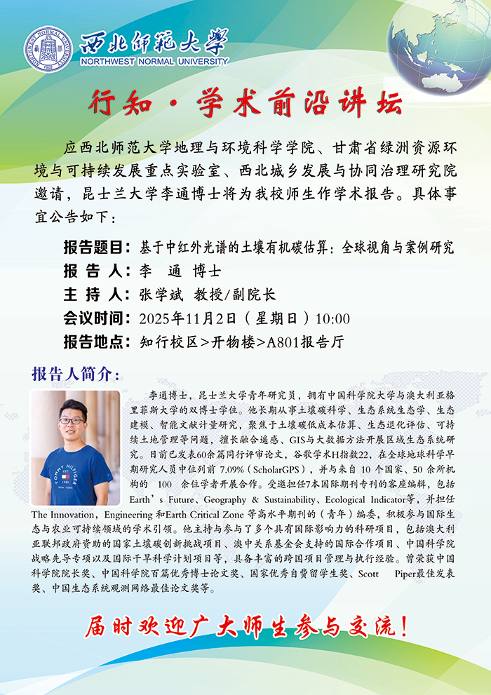 英国365行知•学术前沿讲坛2025-24期:基于中红外光谱的土壤有机碳估算:全球视角与案例研究