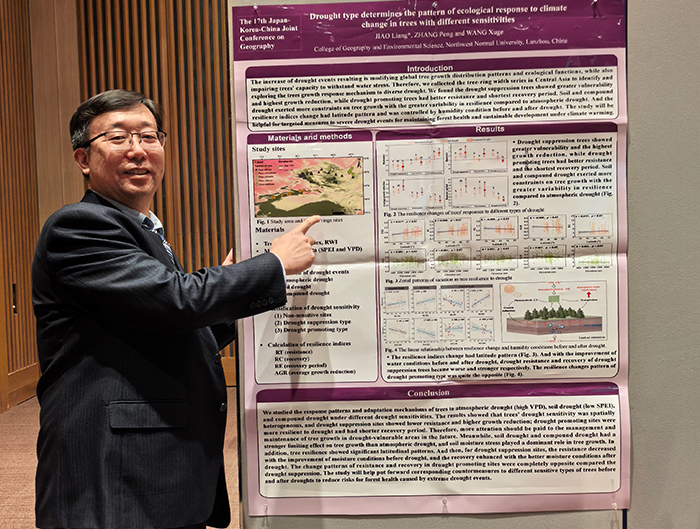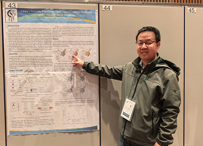焦亮教授和潘竟虎教授以展板的形式展示了研究成果,主题分别为“Drought type determines the pattern of ecological response to climate change in trees with different sensitivities”(干旱类型决定不同敏感性树种对气候变化的生态响应模式)和“China's Intercity Population Flow Network and its Resilience under the COVlD-19 Pandemic”(中国城际人口流动网络及其在新冠疫情下的韧性),并就研究成果与参会人员进行了深入交流。