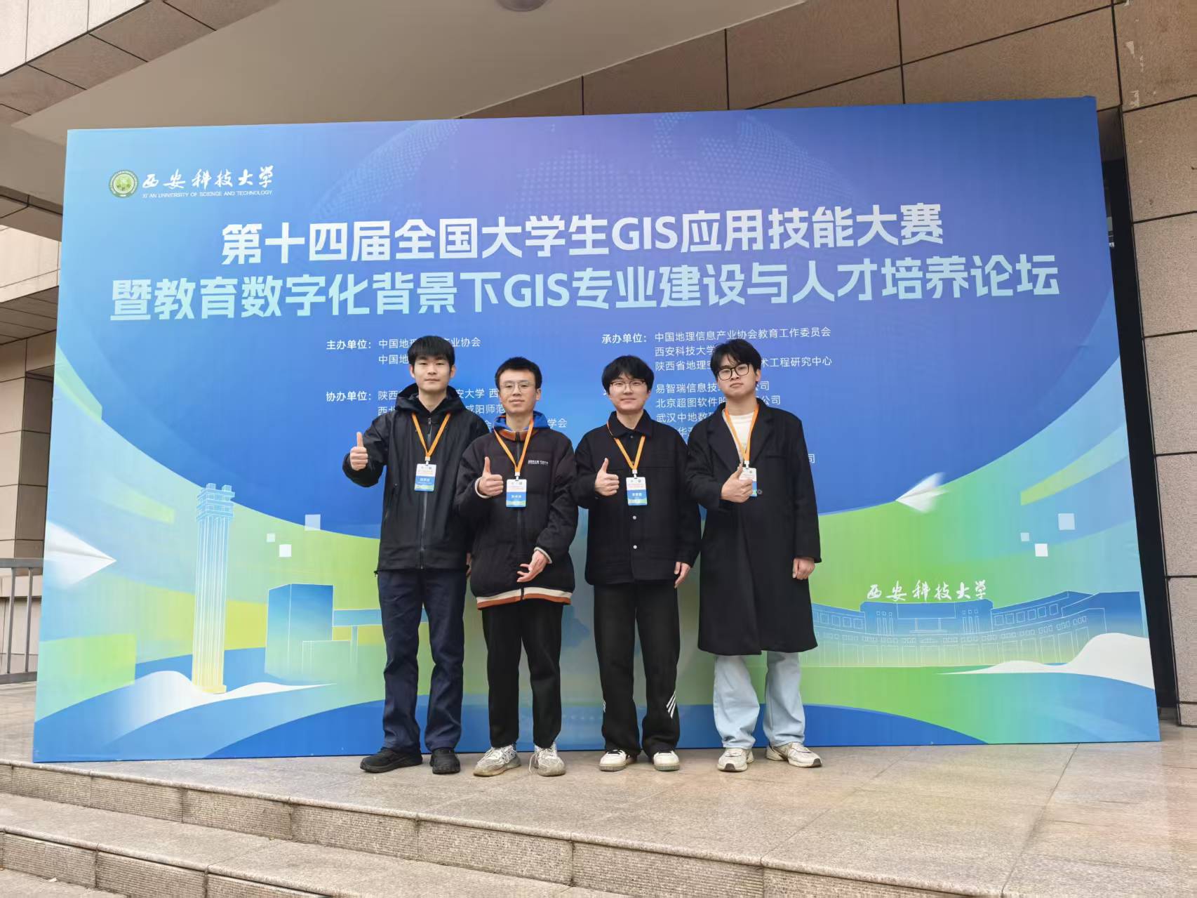 2025年11月14日至16日,由中国地理信息产业协会、中国地理学会共同主办的第十四届全国大学生GIS应用技能大赛在西安科技大学举行。我院2023级地理信息科学专业1班李紫桐、孙冰冰、杜广良、王宇扬四位同学组成的参赛团队,凭借扎实的专业基础、出色的团队协作与稳定的临场发挥,经过全天激烈角逐,从全国百余所高校的182支队伍中脱颖而出,荣获大赛特等奖。张寅丹、姚晓军两位老师同时获评 “特等奖优秀指导老师” 。
