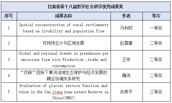 近日,中共甘肃省委、甘肃省人民政府联合发布《关于表彰第十一届敦煌文艺奖获奖作品和第十八届哲学社会科学优秀成果的决定》,地环学院5项研究成果荣获甘肃省第十八届哲学社会科学优秀成果奖,其中一等奖1项、二等奖3项、三等奖1项。