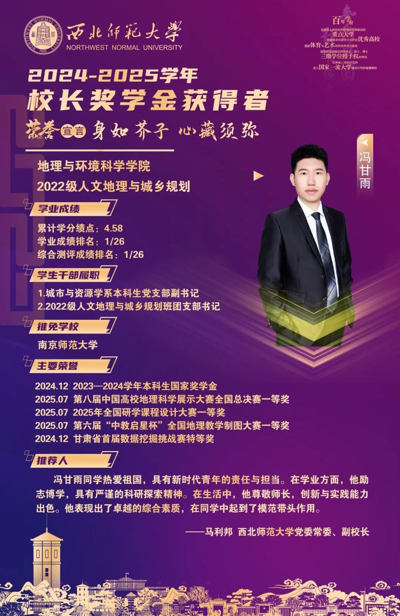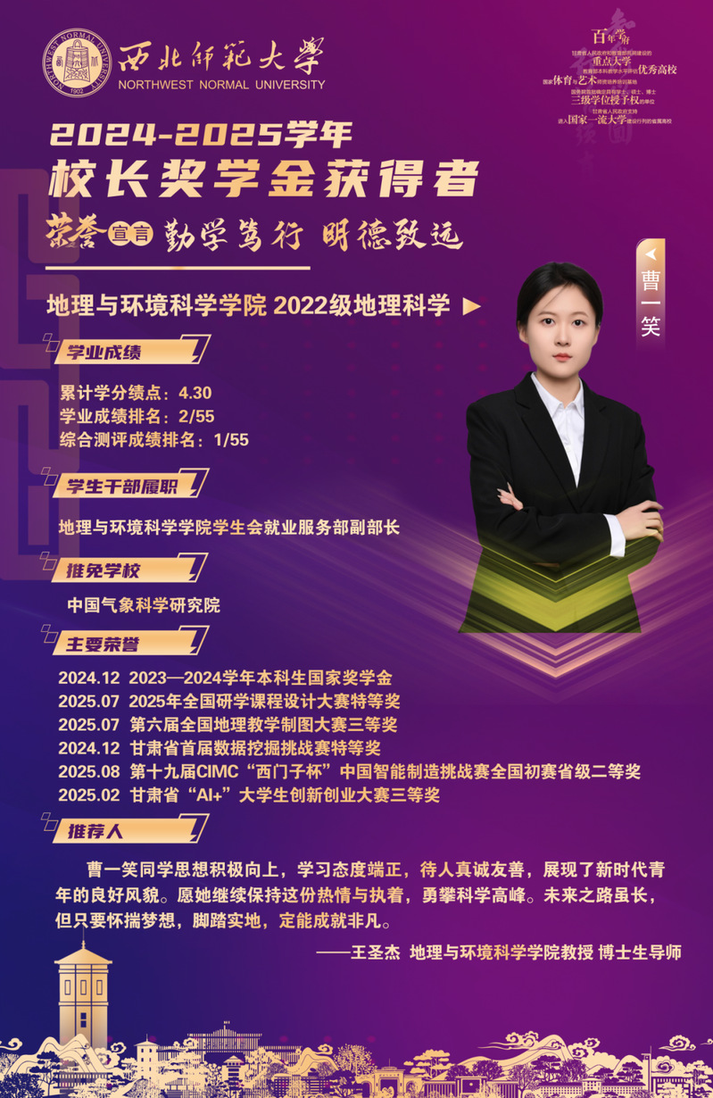 曹一笑同学坚持钻地理,察万象,用知识探索自然地理奥秘,以创新学术成果与社会服务诠释青年担当;冯甘雨以实践为翼,用脚步丈量祖国的山河经纬,用青春行动书写青年责任。两位学子在学术探索中夯实理论根基,在实践奉献中传递青春力量。他们的成长既生动彰显了学院的育人成效,更以“扎根专业、知行合一”的鲜活实践,为全院学子树立了可感可学的鲜明榜样。